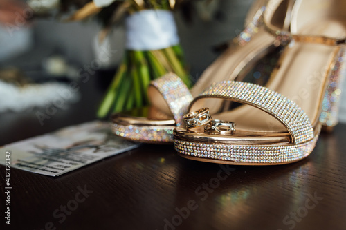 beautiful gold wedding rings on wooden table next to bouquet and shoes