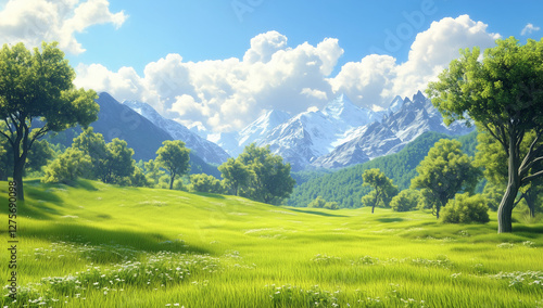 Beautiful green meadow with trees and mountains in the background, fantastic landscape, bright daylight, blue sky, white clouds
