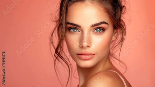 beautiful lady brunette, on orange background, clear glowing skin with copy space