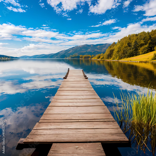 Beautiful lake landscape with row boat and old wooden lake bridge with beautiful sky and cloud background, place for rest and relax, calm water with fresh environment.