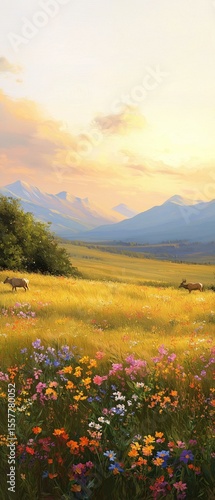 Beautiful landscape of a field of wildflowers with mountains in the background. the sky is painted in a warm orange and yellow hue, with the sun setting in the distance.