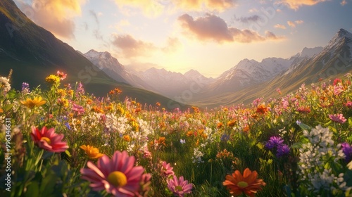 Beautiful landscape of wild nature with colorful wildflowers, lush green meadows, and a clear sky, creating a picturesque scene