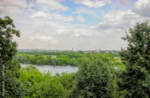 Beautiful landscape view of the city. Middle background green trees, bushes and grass. Big river. In the distance, houses, pipes, buildings.
