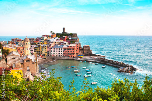 Beautiful landscape with colorful houses on the cliffs in Vernazza, Cinque Terre, Italy, Europe