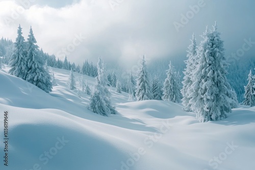 Beautiful landscape with snow covered fir trees and snowdrifts.Merry Christmas and happy New Year greeting background with copy-space.Winter fairytale , ai