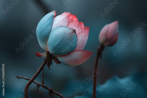 Beautiful lotus flower blooming at dusk in serene aquatic landscape displaying vivid colors and delicate petals