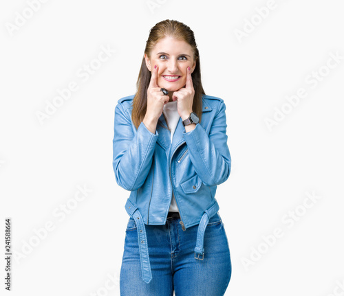 Beautiful middle age mature woman wearing fashion leather jacket over isolated background Smiling with open mouth, fingers pointing and forcing cheerful smile