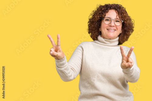 Beautiful middle ager senior woman wearing turtleneck sweater and glasses over isolated background smiling looking to the camera showing fingers doing victory sign. Number two.