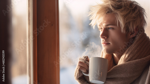 Beautiful model in cozy clothing looking outside the window to a winter scene with a cup of hot coffee