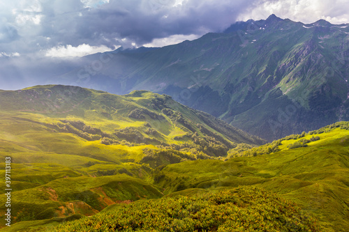 Beautiful mountain landscape at Caucasus mountains with clouds and cloudy sky