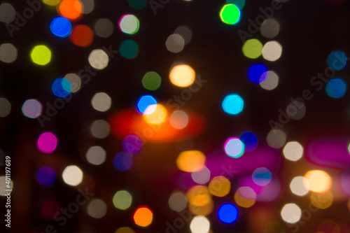 Beautiful multicolored blurred bokeh lights holiday glitter background for Christmas New Years Eve celebration with golden garland sparkling