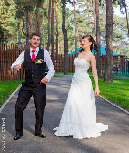 beautiful newlyweds dancing at their wedding in the park on a summer day
