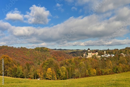Beautiful old romantic castle Sovinec at sunset with autumn landscape.