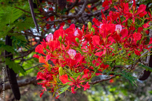 Beautiful orange flamboyant flowers in fine detail with selective focus and depth of field blur