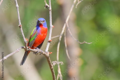 Beautiful painted bunty, perched in habitat against a blurry background.