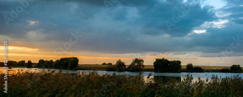 Beautiful panorama of the sunset sky over the lake, dark clouds contrasting with the warm light of the setting sun reflected in the water.
