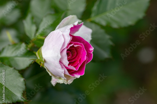 Beautiful pink and white rose on green background
