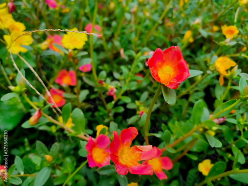 Beautiful pink portulaca oleracea flower, also known as common purslane, verdolaga, little hogweed, red root, or pursley with green leaves. Selective focus.