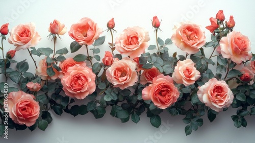 Beautiful Pink Roses with Green Leaves on White Background. Generative AI