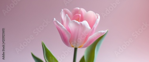 Beautiful pink tulip flower with soft petals on a pastel pink background.