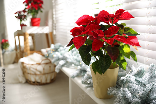 Beautiful potted poinsettia (traditional Christmas flower) and festive decor on window sill at home. Space for text