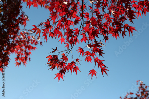 Beautiful red maples blazes brightly in sunny day before it falls for autumn, South Korea
