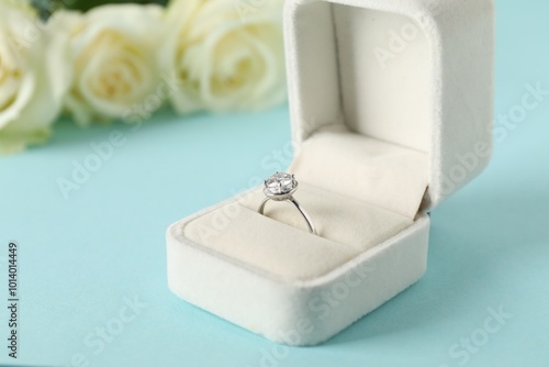 Beautiful ring with gemstone in box and flowers on light blue background, closeup
