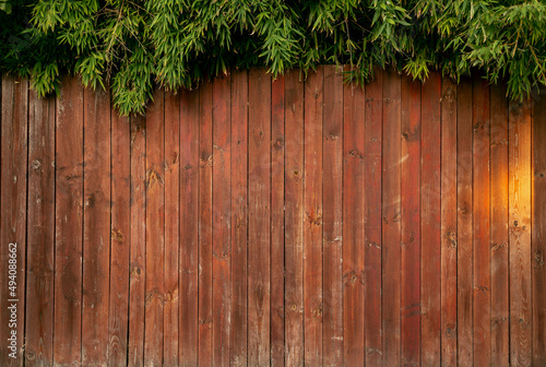 Beautiful rustic red wood fence and bamboo plant over the top of it