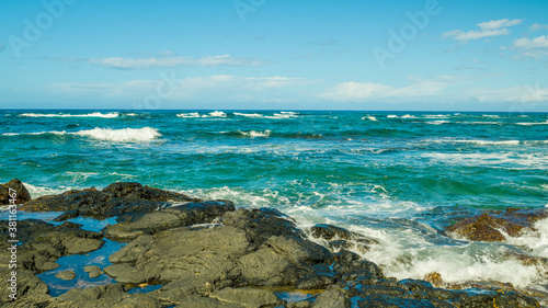 Beautiful shore. Large boulder among the waves in the sea. Hawaii