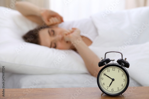 Beautiful sleeping woman resting in bed and trying to wake up with alarm clock