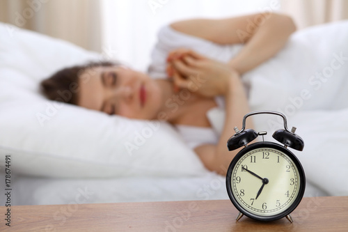 Beautiful sleeping woman resting in bed and trying to wake up with alarm clock