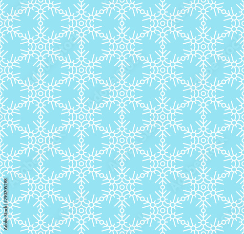 Beautiful snowflakes seamless pattern layout. Thin line white snowflakes on light blue background. Template for christmas gifts wrapping paper. Simple snowy wallpaper vector illustration.