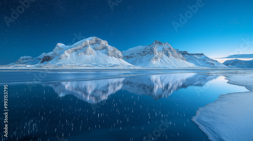 Beautiful snowy mountains and colorful sky with clouds and golden sunlight at sunrise in winter. Landscape with rocks in snow, sea coast, reflection in water at dawn