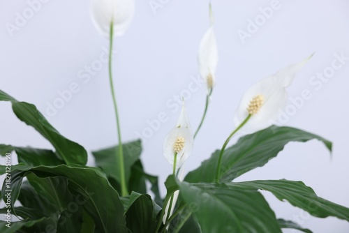 Beautiful spathiphyllum (peace lily) houseplant with flowers on light background, closeup