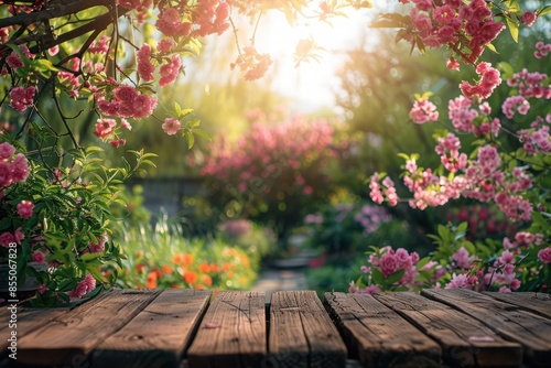 Beautiful spring background with vibrant foliage and blooming branches, showcasing an empty wooden table in a sunny garden setting Perfect for outdoorthemed content