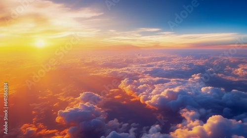 Beautiful sunset sky above clouds with dramatic light. Cabin view from airplane
