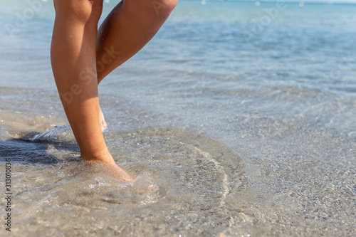 Beautiful tanned legs of a girl walking in the water. The girl runs through the sea water on the edge of the beach.