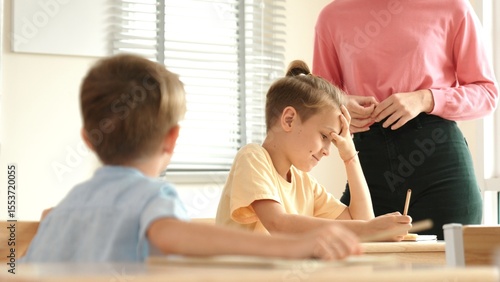 Beautiful teacher explaining test while caucasian boy doing classwork and listening explanation. Cute child looking at teacher while taking a notes or writing answer in paper at classroom. Pedagogy.