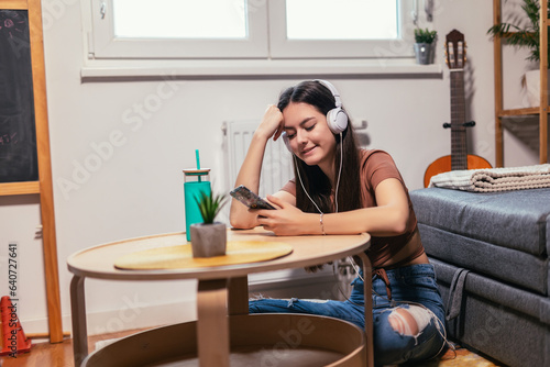 Beautiful teenager girl surfing social media on smart phone while having leisure time at her home.