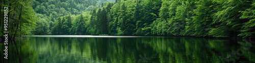 Beautiful tranquil lake encircled by abundant greenery and trees.