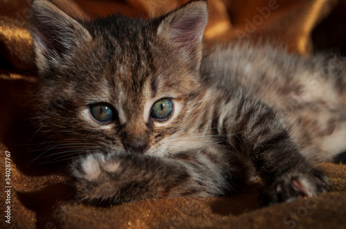 Beautiful tricolor kitten with blue eyes is sweetly laying on the gold bedcover and looking forward. Pet in the home