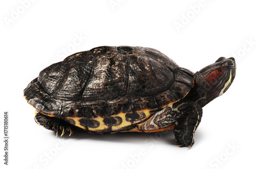 Beautiful turtle (Red-eared slider) on white background