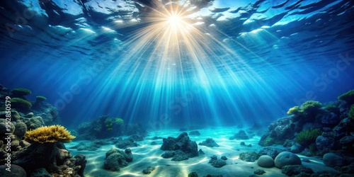 Beautiful underwater landscape of a deep ocean with sun rays reaching the rocky seabed, deep ocean