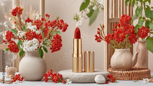 Beautiful vase holding fresh flowers next to a vibrant lipstick in a soft background ideal for lip care themes