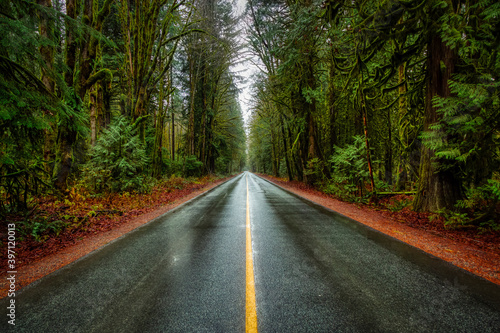 Beautiful View of a Scenic Road in the Green Forest during a rainy fall season day. Taken in Squamish, North of Vancouver, British Columbia, Canada.
