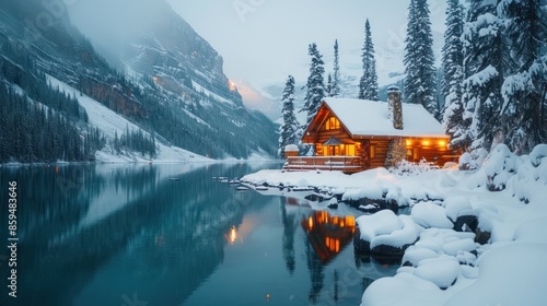 Beautiful view of Emerald Lake with wooden lodge glowing in snowy pine forest on winter at Yoho national park ai generated