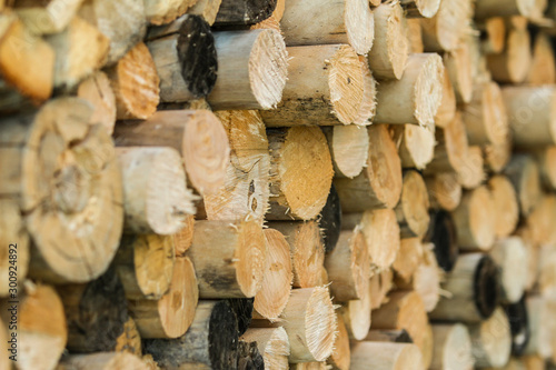 Beautiful view of home yard garage wall with stacked firewood for winter months.