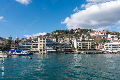 Beautiful view of the Bosphorus shore on a sunny day, full of residential houses, Istanbul, Turkey.