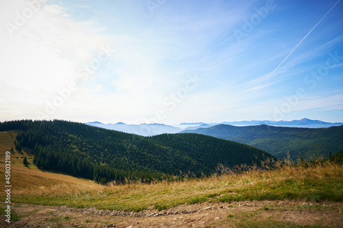 Beautiful view of the colorful mountains covered coniferous forests. Colorful sunset. Ukraine