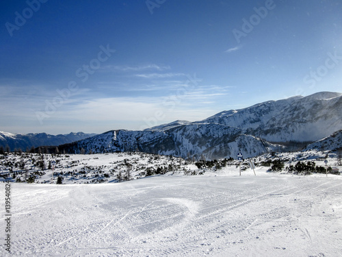 Beautiful views of snowcapped Alpine mountain range in Austria.